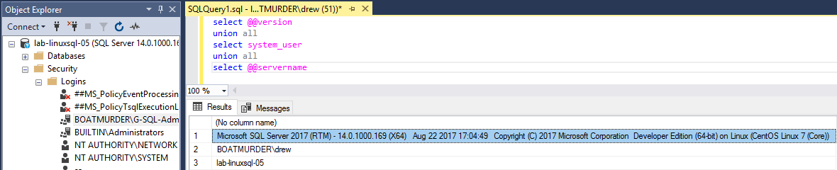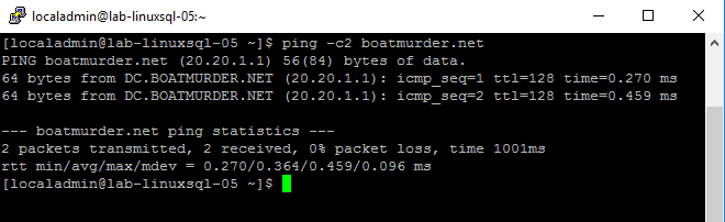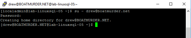 If you attempted to follow the Ubuntu guide, you might be wondering why this was a lot less work. Well, in short: the realm command takes care of a lot of configuration that our previous guide required, automatically. Realm takes care of configuring sssd (the critical piece for SQL Server authentication) and all the other domain-level authentication for the OS, too. Which begs the question, can you use realm with Ubuntu? Well, yes… but I’ve had much better success manually configuring all the services myself. Try it for yourself and see!